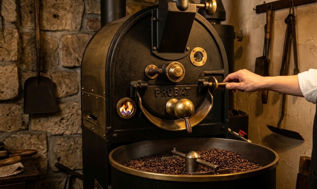 世界中のコーヒー愛好家が憧れる、1948年製のドイツ・プロバット社製焙煎機。2026年の現在においても、このヴィンテージマシンが現役で動いていること自体が奇跡に近いと言えるでしょう。厚い鋳鉄製の釜でじっくりと熱を通すことで、現代の焙煎機では表現できない「重厚で丸みのあるコク」が生まれます。職人がその日の気温や湿度、豆の状態を見極めながら操作する様子は、まさに職人技の極致です。