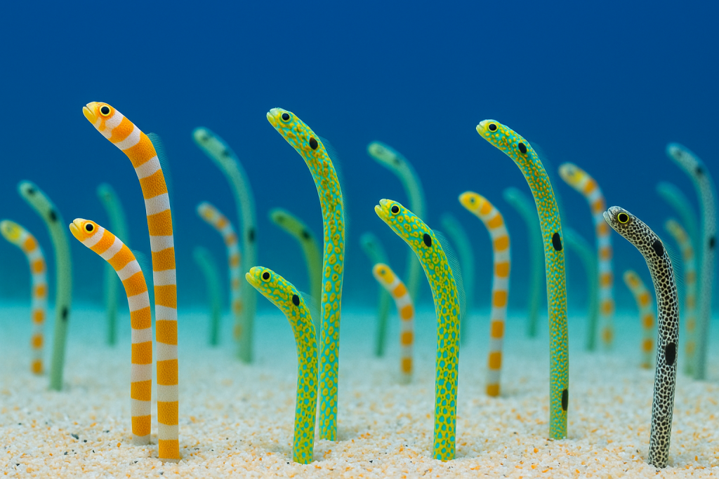 その見た目から「庭の草が揺れているよう」とも言われ、英語名は Spotted Garden Eel(スポッテッド・ガーデン・イール)。